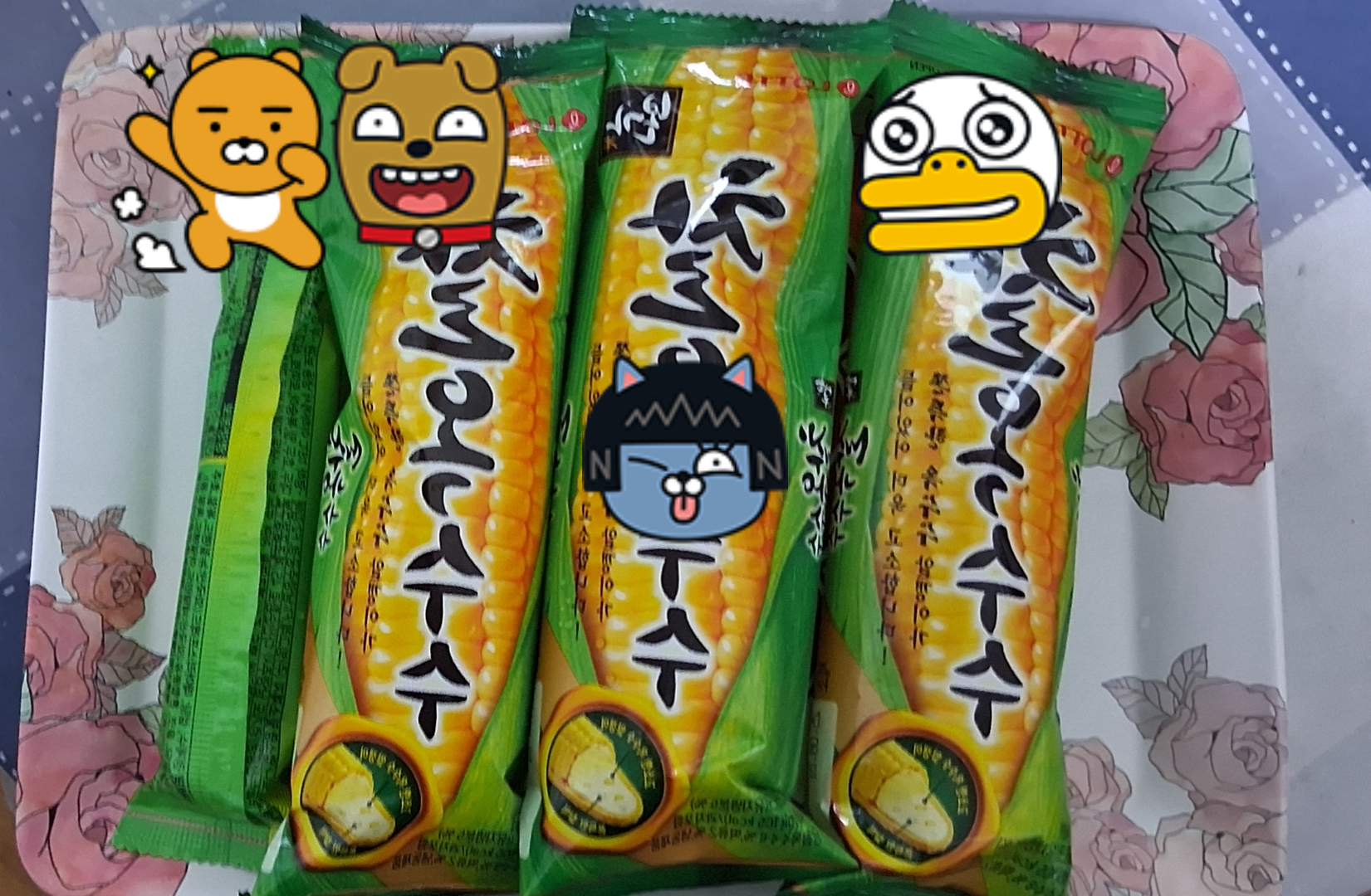 더위 핑계삼사 옥수수모양 아이스크림을 먹습니다.